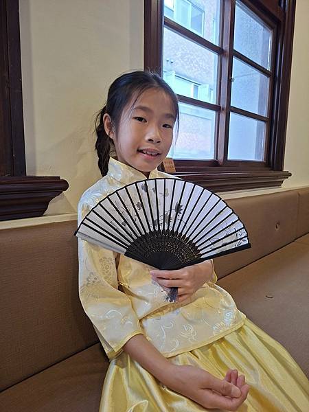 貝貝選了黃色的鳳仙裝,上衣保留了旗袍的特色,和下裙是分開的,這樣活動方便。她則是選了一把扇子。