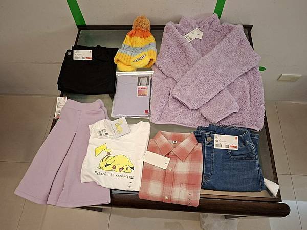 貝貝買了她最喜歡的毛茸茸材質外套、牛仔褲、發熱衣、法藍絨襯衫、皮卡丘短袖T,這樣退稅完總共 JPY $8209。